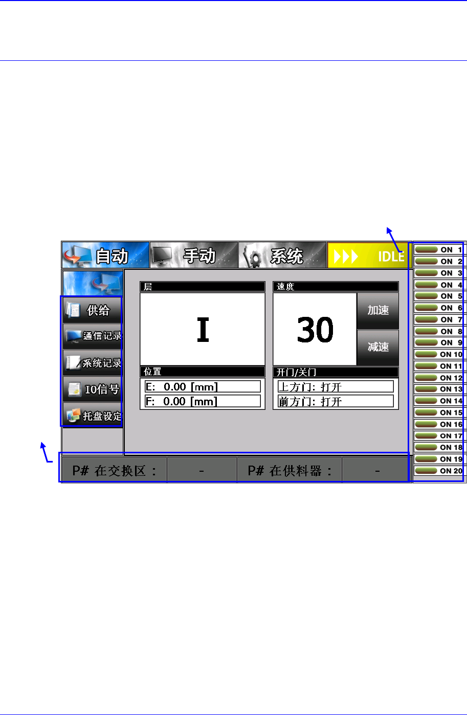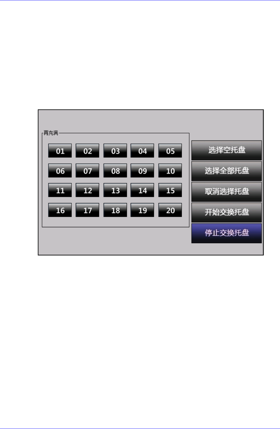 High Speed Multi T ray Feeder STF-100NA 用户手册 7-2 <POSITION> 领域 各轴的位置用数据化方式显示。 <DOOR LOCK> 领域 显示 DOOR 的当前状 态。 7.2. REFILL 点击 <REFILL> 按钮时显示如下画 面。 托盘手动更新, 被选段依次上升 到上部 Buffer 。 图 7-2. “A UT O: REFILL” …