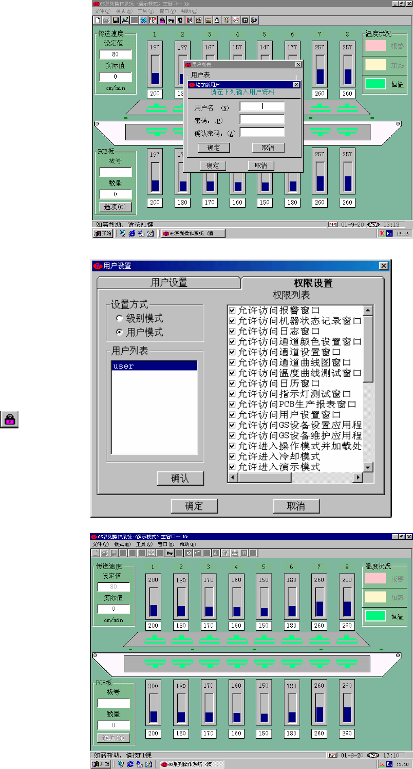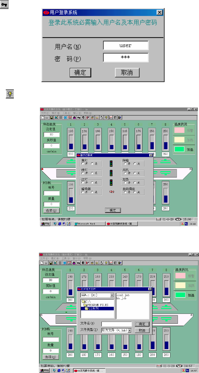 劲拓电子设备有限公司 第 2 6 页 共 59 页 GS 系列无铅回流焊机用户手册 7.2.3.14 登录系统选项: “锁键盘 ”操作后如需恢复到正常 操作时,用户可选择此选项,系统将会 弹出如右图的“ 登录系统 ”对话框,重 新输入正确的用户名及其相应密码,确 定即可。 7.2.3.15 指示灯测试选项: 用于测试机器各控制选项有效性。 仅在“ 演示模式 ”或“ 编辑模式 ” 下可运行,在“ 操作模式 ”下无效。 7.2.3.16 打…
