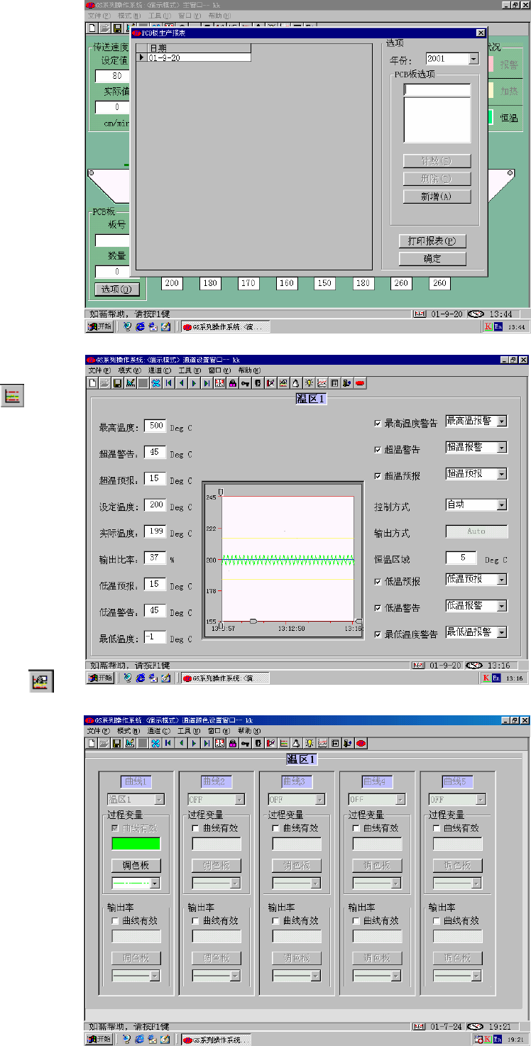 劲拓电子设备有限公司 第 2 9 页 共 59 页 GS 系列无铅回流焊机用户手册 7.2.3.17.4 通道曲线 图窗口 : 在如右图画面可观察各加热区实 际温度曲线图及各加热区功率输出百分 比曲线图。 7.2.3.17.5 报警窗口: 如右图画面,显示当前报警表。 (在发生严重报警时,系统自动进入冷 却状态,在响应并解除报警后选择“ 操 作 ”选项才能重新进入操作状态。) 7.2.3.17.6 温度曲线测试窗口: 用户采用外接测温头…