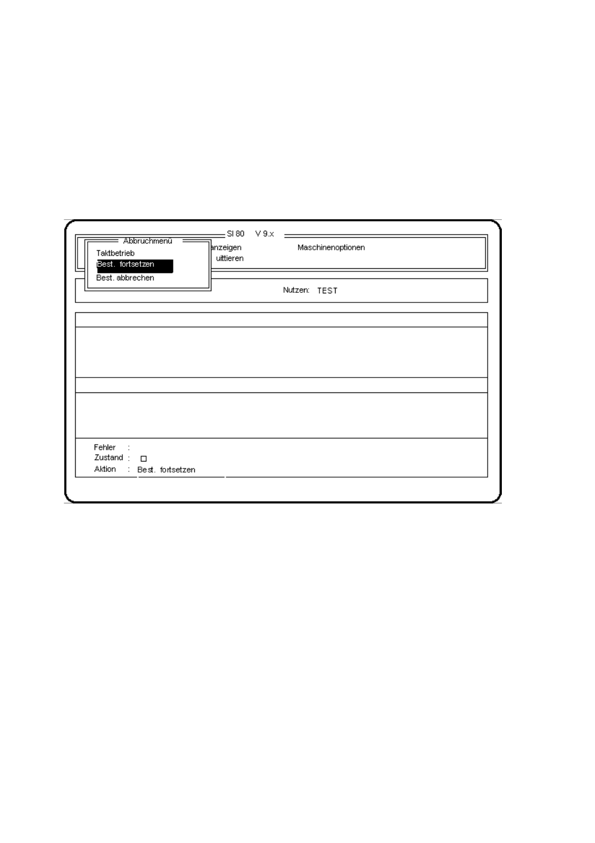 5 Bestücken Betriebsanleitung SIPLACE 80 S/F/G 5.6 Fehlermenüs Ausgabe 12/96 ab Softwarevers ion SR.009.xx 5 - 40 5.6.8 Abbruchmenü Um in das Abbruchme nü zu gel angen, a us dem die B estück ung abgebr ochen od er der Ta…