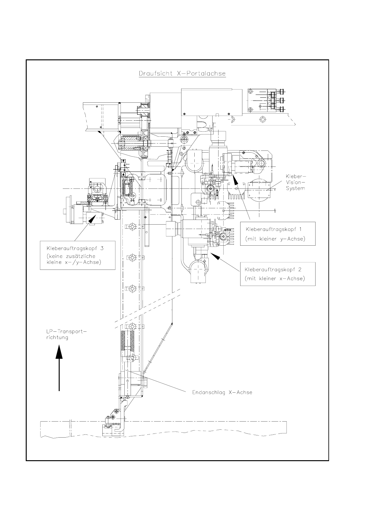 Abb. 9.9.1 Übersicht: Anordnung der Kleberauftragsköpfe 1,2 und 3 an der X-Portalachse