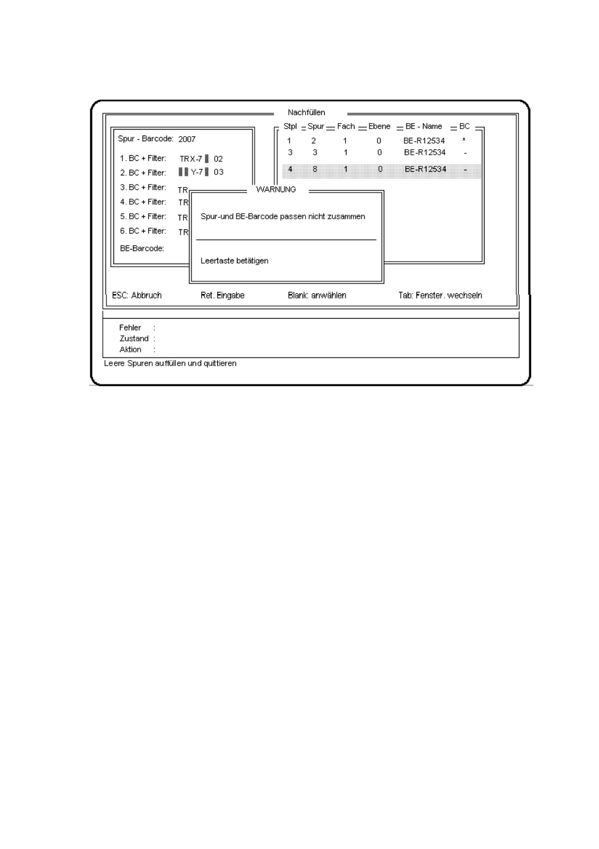 Falls für die angewählte Spur "kein BE-Barcode (- in Spalte BC) " eingegeben ist, kann wie "ohne Nachfüll-