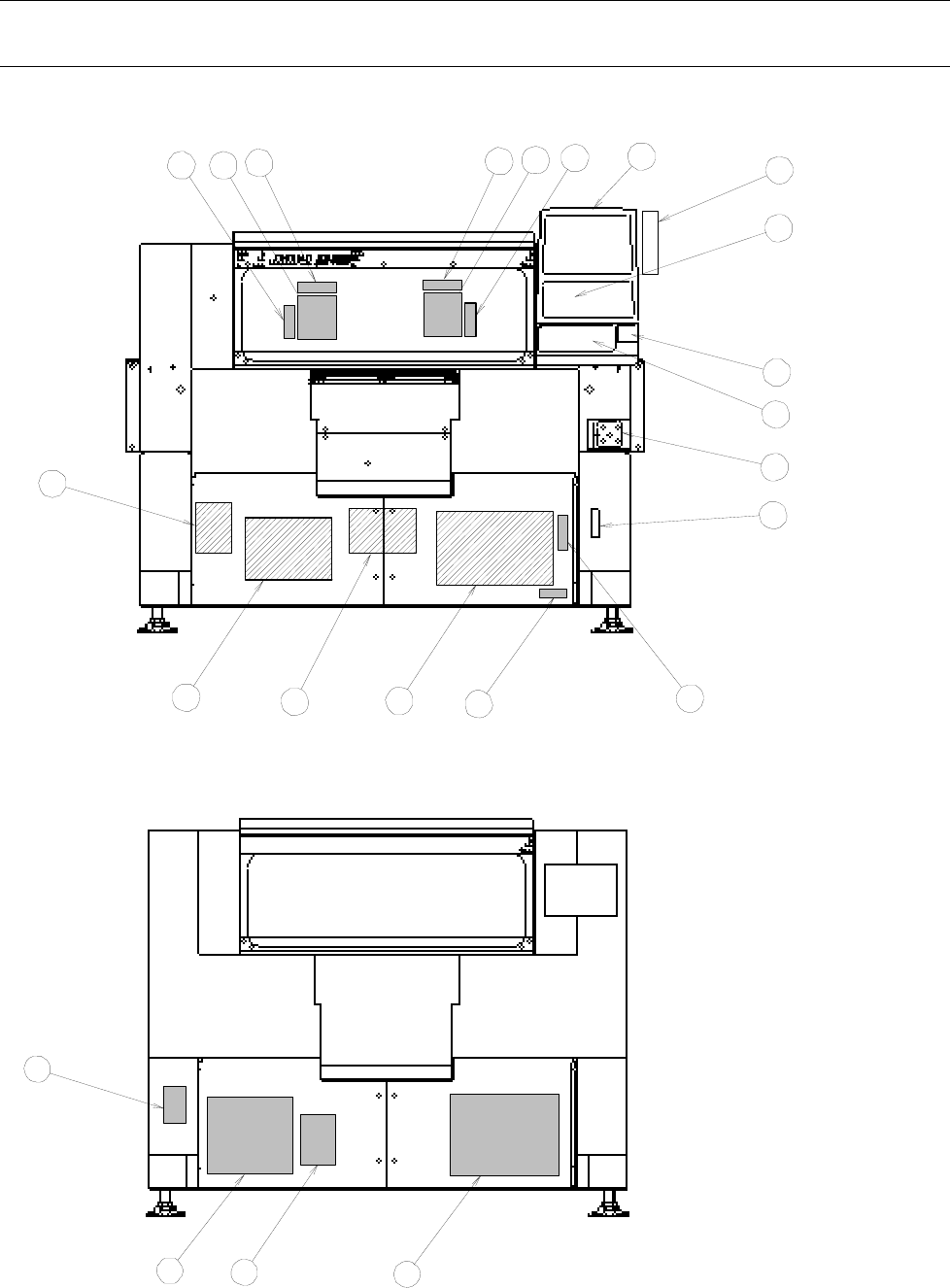 Rev 2.00 动作说明书 1-1 1 .电气装备部概要 1-1 .电气装备部的布局 各部分的名称 1. 液晶监视器 2. HOD 3. 操作盘 〔前侧、操作基板、操作 SW 基板〕 〔后侧:操作 SW 基板〕 4. 键盘 5. 跟踪球 6. 电源开关 7. CD-ROM 8. FDD 9. HDD 10. 控制器 〔 CPU 板、 位置板 ( 24/12 轴) 、 母线桥板、 MCMR 、 SAFETY 基板、 BaseFeeder…