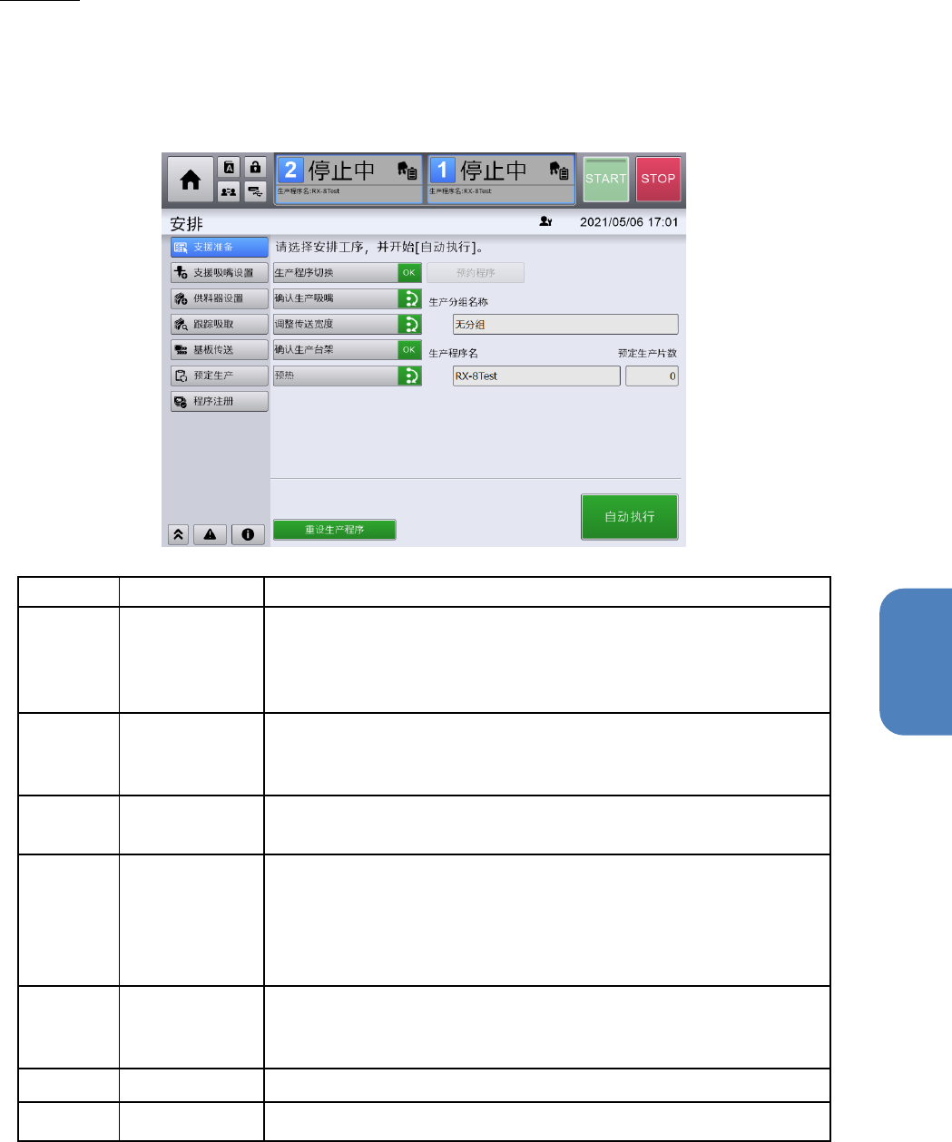 开始生产前做好安排,使本机各部位做好准备。安排分为支援准备和不同作业的单独安排。