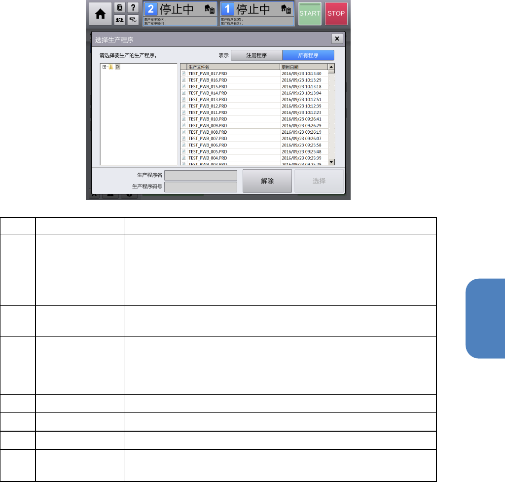 生产程序名列表 列表显示可选择的生产程序的信息。