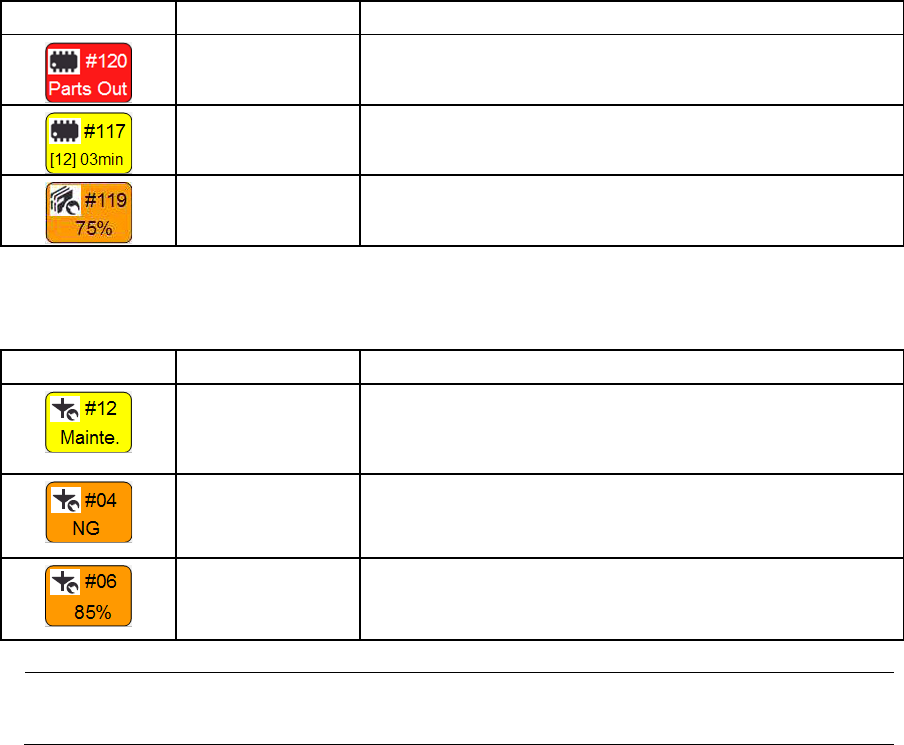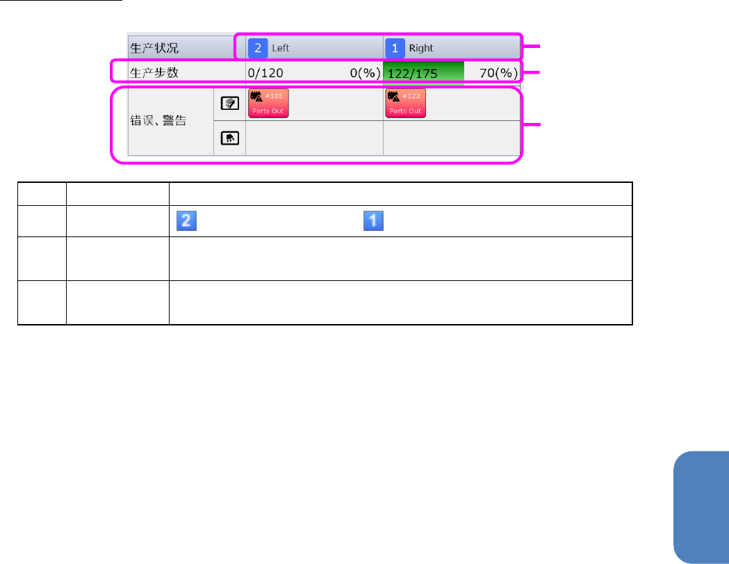 第 4 章 操作篇 4-3 生产 43 4 错误,警告的显示 记号 名称 说明 (a) 单元显示 [ Left ] 表示单元 2 (左侧), [ Right ] 表示单元 1 (右侧)。 (b) 生产步数 通过右侧的数 值和进度条,显示正在生产的生产程 序中已经完成贴片的贴 片元件数的进度比例。 (c) 错误, 警告 通过图标和文字显示各单元内的 供给部 ,贴片头,吸嘴 所发生的错误,警 告状况。 a b c