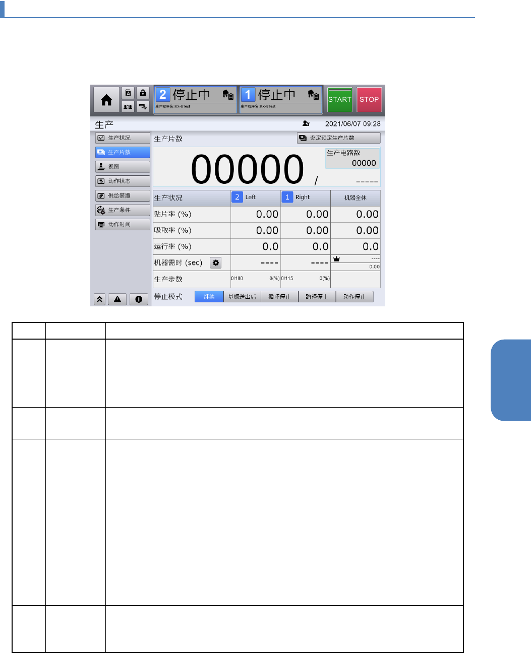 贴片率,吸取率,运行率,需时的各生产管理信息的值,显示与[记录]菜单的