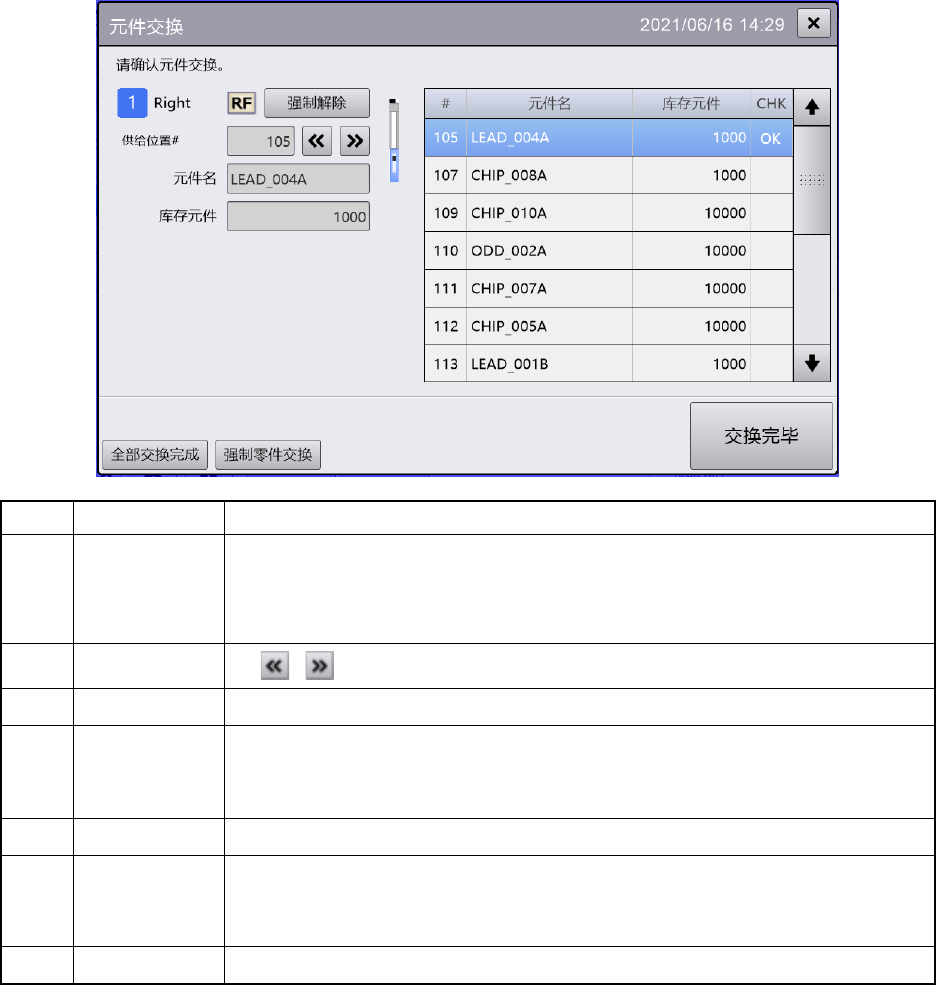 第 4 章 操作篇 4-4 元件交换 77 4 记号 名称 说明 (h) 强制元件交换 由于 供 料器的故障 等 原因, 进行供料器更换操作,转换到未发生元件缺料的供 给部。 仅当用户级别为 [ SUPERVISOR ]或 [MAINTENANCE ] 时,才能 操作此 项。 将 [ 强制元件交换 ] 设定为 ON 后,可选择未发生元件缺料的 供给位置 ,通过按 [ 交换完毕 ] 按钮 使操作变为交换完毕状态, [ 元件交换列表 ] 的…