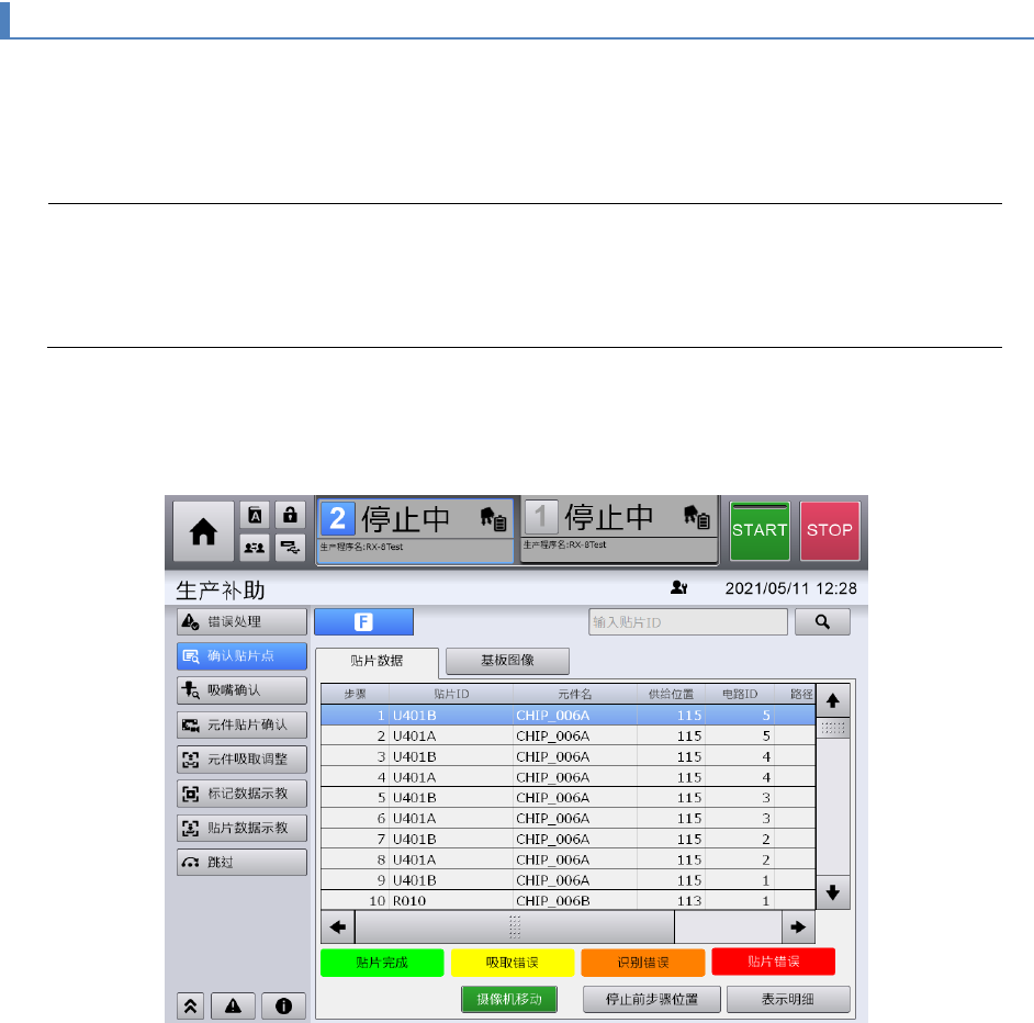 第 4 章 操作篇 4-6 生产补助 98 4-6- 2. 贴片点 确认 触摸 [ 生产补助 ] 画面子菜单面板中的 [ 贴片点 确认 ] ,显示 [ 贴片点确认 ] 画面。 显示正在生产的生产程序 中的 贴片数据,显示指定 步骤的贴片 数据 / 元件资料 的详情 , 贴片 ID 为关键字的贴 片步骤,基板示意图中的步骤位置 搜索操作 , 正在生产的 生产程序中的基板示意图。 Tips 正在生产中的单元处于贴片步骤状态 下时不实时更…