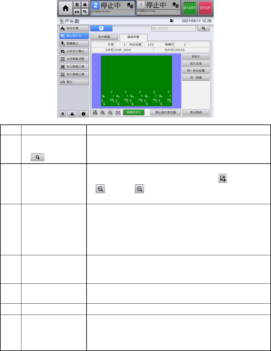 第 4 章 操作篇 4-6 生产补助 100 [ 基板图像 ] 选项卡 显示当前正在生产的 生产程序 的基板示意图。 记号 名称 说明 (a) 贴片 ID 搜索文本框 / 贴片 ID 搜索 按钮 ( ) 以贴片 ID 为关键字,从选择的步骤中 搜索 数据(部分 搜索 * )。存 在匹配数据时,将把基板示意图对应 的步骤位置变为选择状态。 * 可以只使用贴片 ID 的一部分搜索。 (b) 基板示意图 显示对象通道上正在生产的基板示意 …