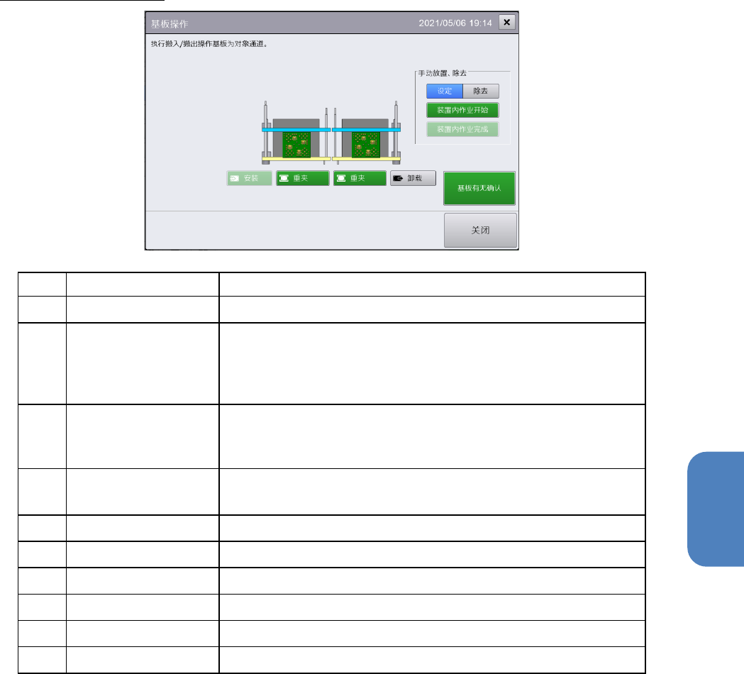 用手动放置基板时,在触摸[设定]后,触摸[装置内作业开始],将基板放到本机内部的作业通道上,然后
