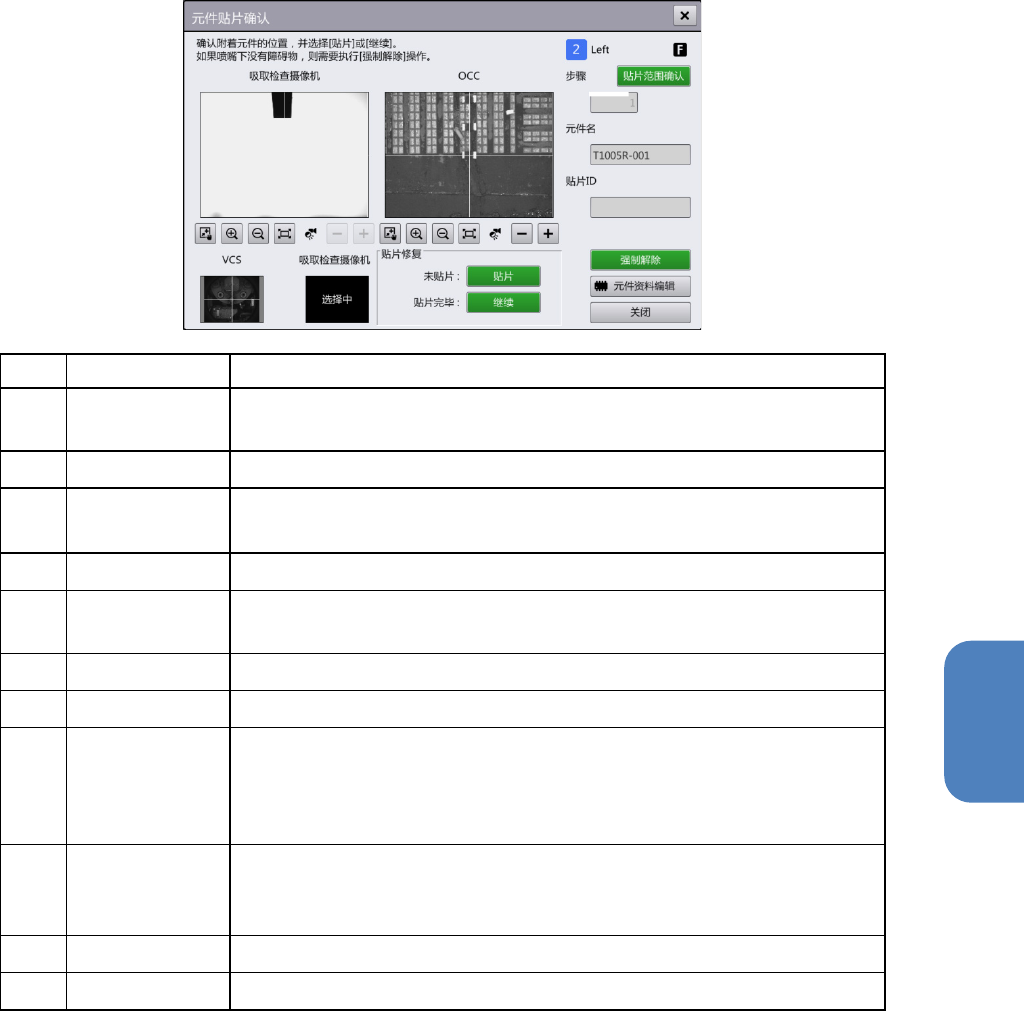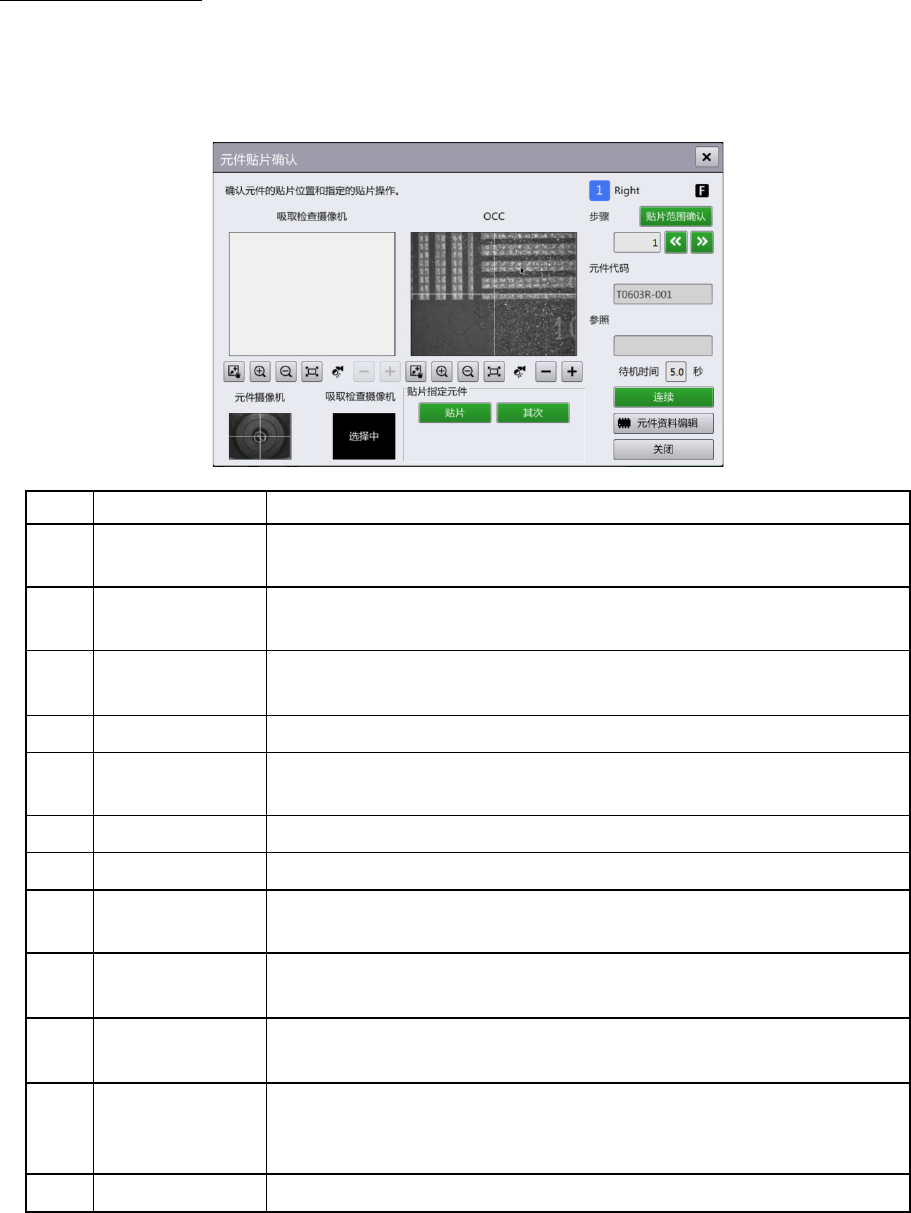 在[元件贴片确认]对话框中,可对正在生产的基板,用 OCC 确认是否有未贴片元件的步骤,针对未贴片的