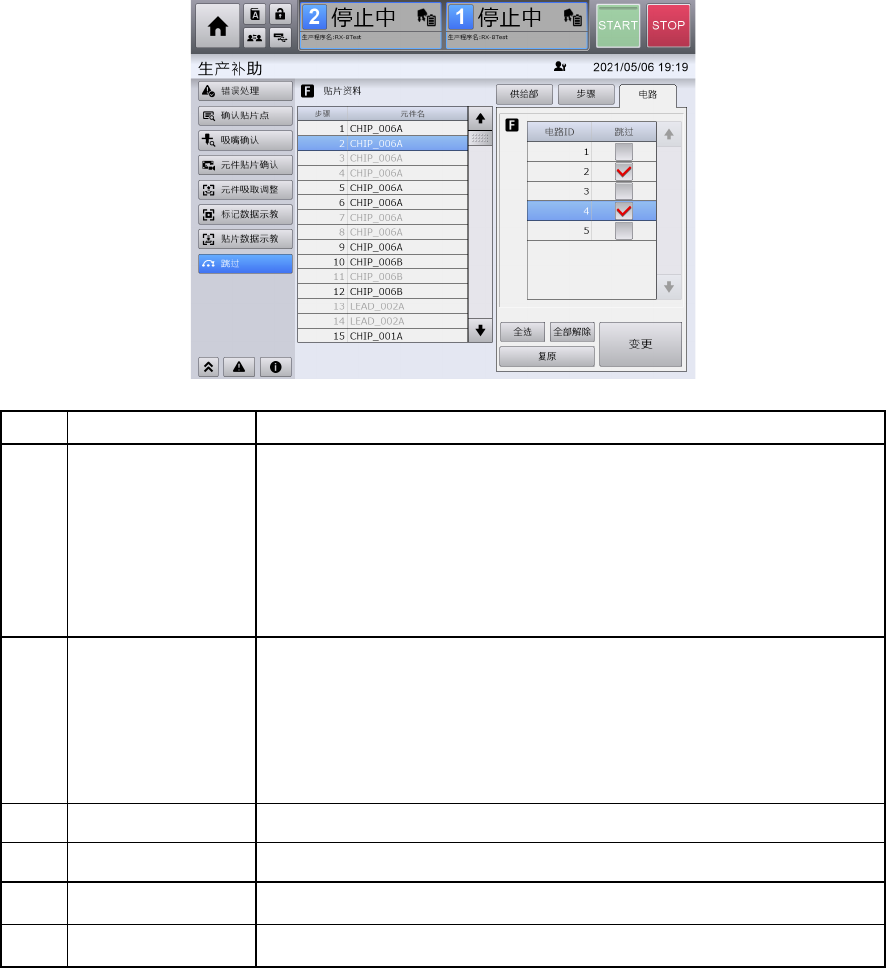 触摸[电路]显示[电路跳过列表],勾选[跳过],触摸[变更]后,所勾选的电路 ID 的电路的贴片步骤,将在