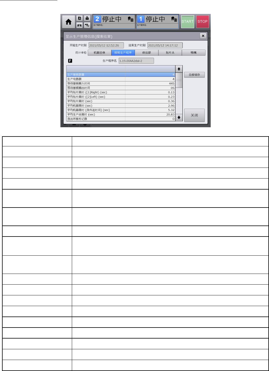 第 4 章 操作篇 4-8 记录 140 按照 生产程序 选项卡 按各生产程序列表显示统计的生产管 理信息的详细数据。 名称 说明 生产基板数量 显示生产 基板数 量( 贴片 完成的基板块数)。 生产电路数 显示生产电路数(贴片完成基板的电 路数)。 等待基板搬入时间 显示上游单元等待基板搬入 时间。 等待基板搬出时间 显示下游单元等待基板搬出时间。 平均贴片需时 ( [ 1 ] Right ) (sec) 显示单元 1 (右侧)中每 …
