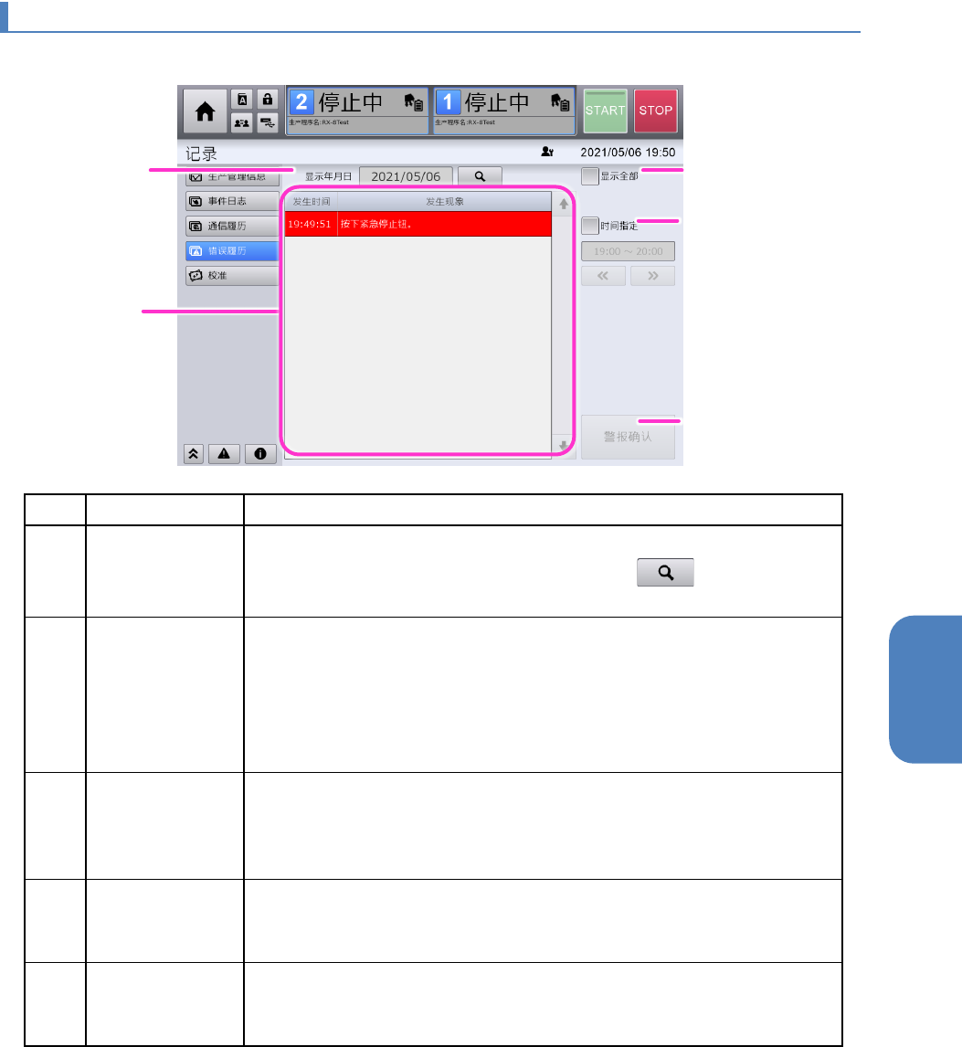 触摸[记录]菜单的[错误履历],即显示[错误履历]画面。