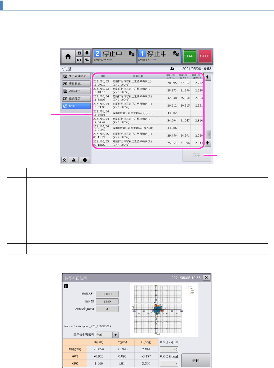 第 4 章 操作篇 4-8 记录 152 4-8- 6. 校正记录 触摸[记录]菜单的[校准]即显示 [ 校准 ]画面。 在[校准 ]画面 上,将装置校准项目中 的各 角度转写补正以及进行 Θ 贴片精度补正时的贴片 精度 测量 结果 作为记录信息储存在 装置内 并显示。 记号 名称 说明 (a) 校准记录列表 显示作为校准的记录信 息的以下信息。 • 日期: 显示通过 校准实施补正确认的日期时间 • 校准名称(作业项目名称):显示 校准…