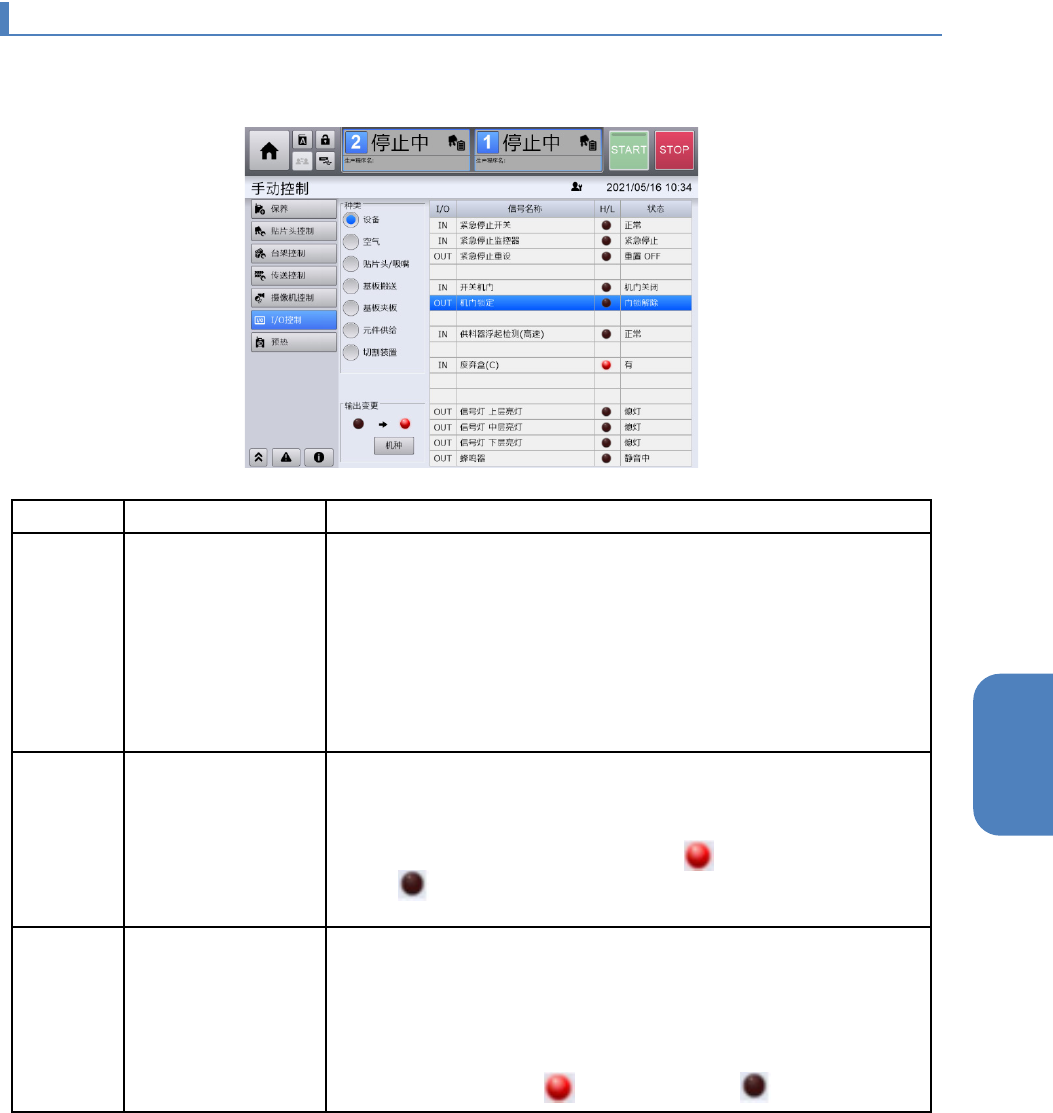 在顶部菜单中按[手动控制] - [I/O 控制]的顺序触摸后,将显示[I/O 控制]画面。