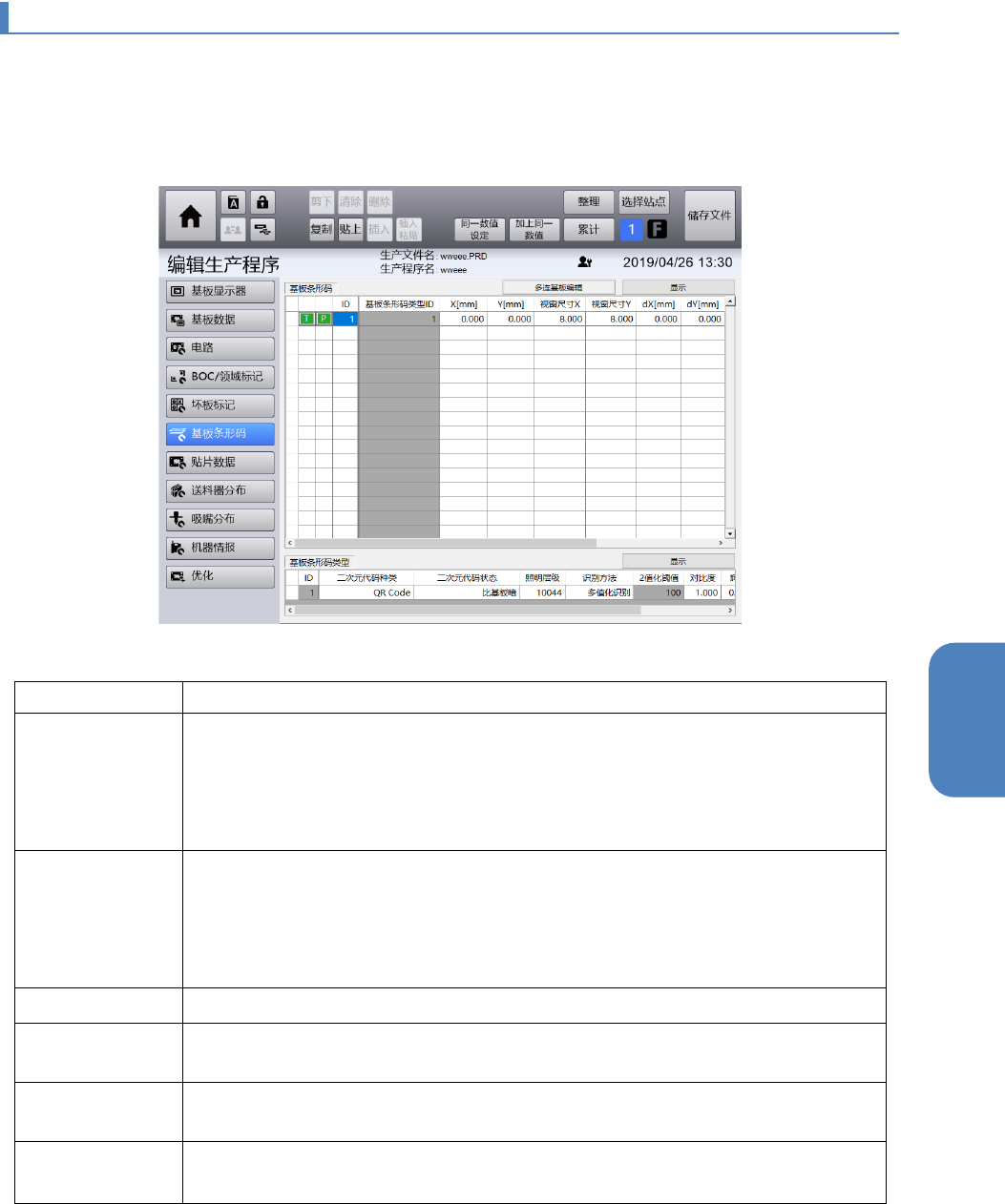 第 4 章 操作篇 4- 11 编辑生产程序 229 4 4- 11 - 7. 基板条形码 编辑 [基板条形码]画面 从[编辑生产程序]菜单画面左侧的 子菜单面板,触摸[基板条形码 ],即显示[基板条形码]画面。 [基板 条形码 ]画面仅在使用生产管理系统,或者事件 通知的追溯功能(选项)时显示。详 情请参看 「 4- 18 IFS - NX 的使用(选项)」或「 4- 20 外部输出功能的使用(选项)」 。 基板条形码 项目名…