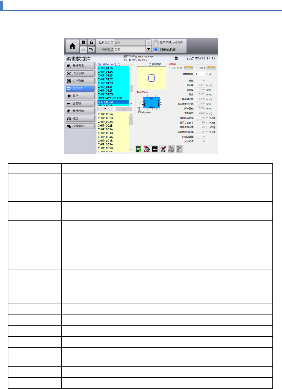 第 4 章 操作篇 4- 12 编辑数据库 256 4- 12 - 5. 元件的脚 / BGA 信息画面 可显示和编辑本机装置内 DB 或者程序中元件资料库中 记录的 元件之脚信息或 BGA 信息。 脚元件时 项目名称 说明 脚形状 选择脚 形状。 Gull - wing : Gull - wing 形脚 J- lead : J- lead 形脚 脚参数 No. 1 种元件 最多可选 择 6 种参数。即使边不同,只要 数据相同,即可…