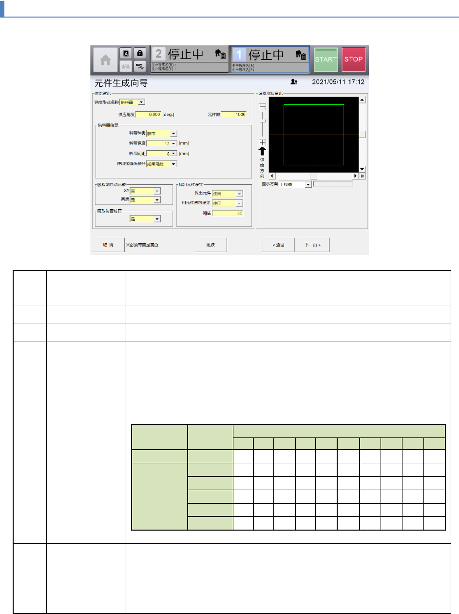 第 4 章 操作篇 4- 13 元件生成向导 271 4 记号 名称 说明 (f) 吸取位 置校正 要进行元件吸取时选择是否使用吸取位 置校正 。 • 是:( 初始值 )在进行了吸取位置校正的吸取位置上吸取元件 • 否: 吸取元件时 不使用吸取位置校正 ( g) 找出元件的 设定 实施找出元件的设定。 • 找出元件:选择是否在吸取位置相机 跟踪 、手动空洞 示教处使用找出 元件功能。使用找出元件时选择 [ 使用 ] ,不使用时选择 [ …