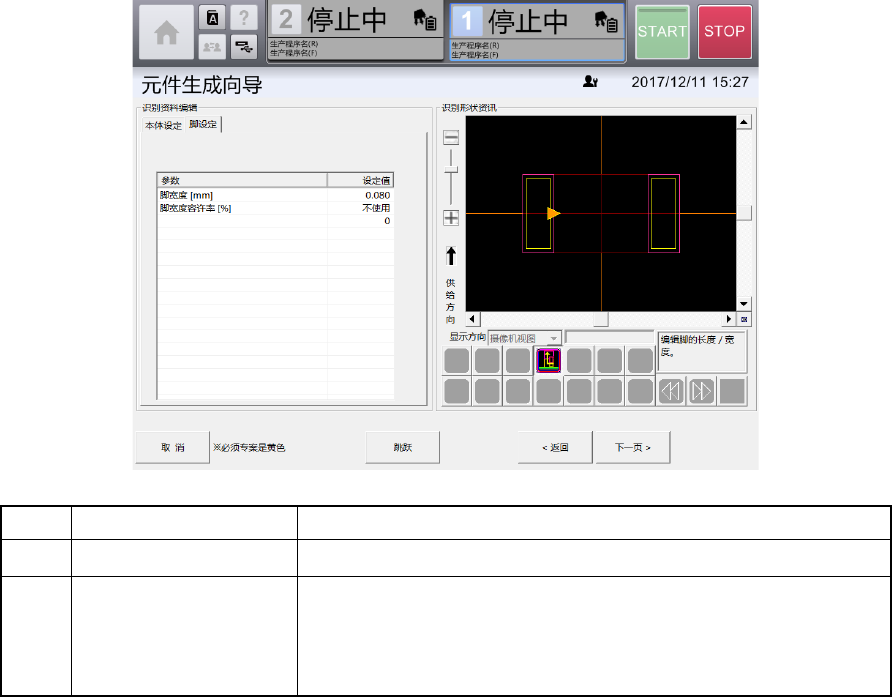第 4 章 操作篇 4- 13 元件生成向导 279 4 记号 名称 说明 (c) 元件的中心设定 (摄像机视图) 对要识别元件的中心 位置进行 设定。 <不取决于使用贴片头的项目> • 元件容纳中心:指定从元件中心起的 相对位置,设定 元件 容纳 中心位 置。 • 元件贴片位置:指定从元件中心起的 相对位置,设定元件的贴片位置 。 • 识别中心偏移量:表示元件贴片位置 与元件存储中心的偏移量。 <依存于 贴片头 类型 的项目> • 元…