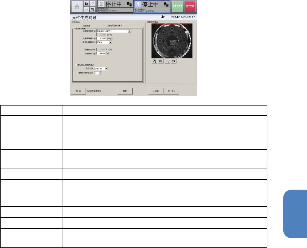 第 4 章 操作篇 4- 13 元件生成向导 296 选择 识别选项(异形元件( 有脚 )) 名称 说明 位置偏离容许值 从下拉列表中选择识别元件时在哪个 范围内进行识别。 • 指定位置:在指定区域内识别。 • 自动算出元件尺寸: 考虑角度、 角度偏差的容许值,自动设定识别区 域后识别。 角度偏离容许值 对识别得到的元件角度与预 计元件所在的角度有偏差时,容许的 角度偏差 量进行设定。 本体对背景极性 在下拉列表中设定元件本体和背景…