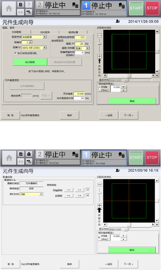 第 4 章 操作篇 4- 14 数据制作步骤 318 7 触摸 [ 下一页 ] 。 显示 [ 吸取、废弃 ] 画面。 以摄像机图像为基础制作、编辑元件 数据时,应使吸嘴吸取元件。 8 触摸 [ 下一页 ] 。 显示[ 影像存取 ]画面。
