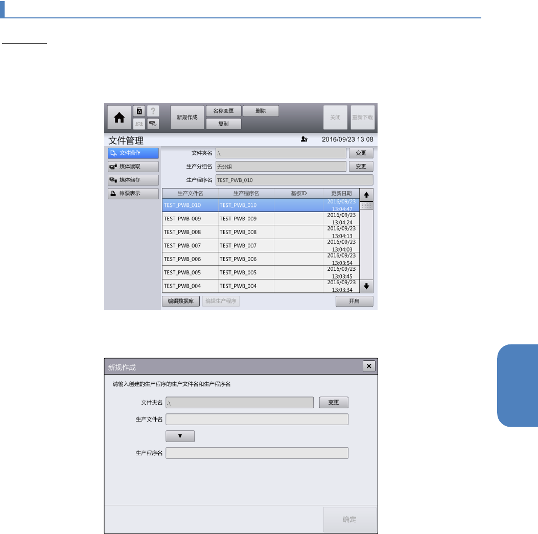第 4 章 操作篇 4- 14 数据制作步骤 331 4 4- 14 - 9. 制作 生产程序 新建数据 在顶部菜单 中按 [ 文件管理 ] - [ 文件操作 ] 的顺序触摸后,将显示 [ 文件操作 ] 画面。 在 [ 安排 ] – [ 支援准备 ] 画面 中生产程序已被载入 时,[文件操作 ]画面 不能 使用。 如果要 新建,请从 生产程序的重设开始进行操作。 1 触摸共 通 面板的 [ 新规作成 ] 。 显示 [ 新规作成 ] 对话…