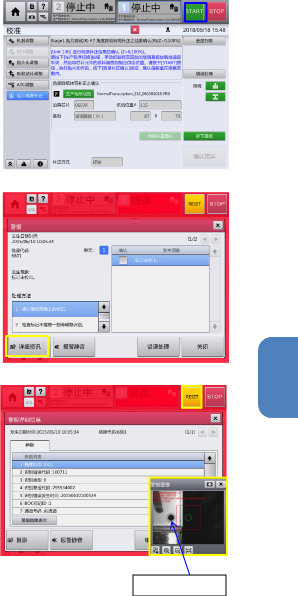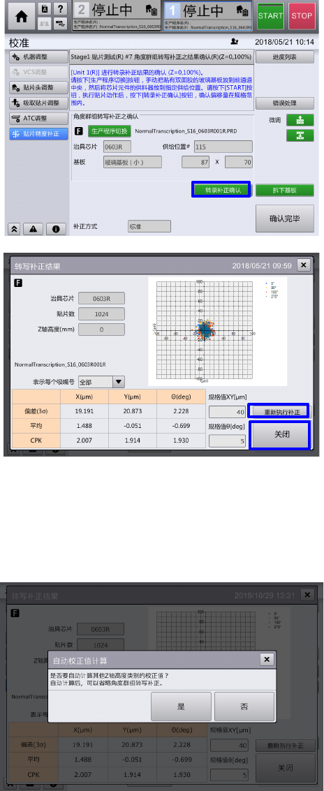 第 4 章 操作篇 4- 16 校准 408 5- 5. 执行贴片精度测量 所有元件贴片完成,选择『转录补正 确 认』后,即会使用装置内的摄像机, 自动 测量贴片后的元件位置。 5- 6. 贴片精度测定结果 的显示 自动测量完成后,即显示结果。 测量结果良好的情况,选择『关闭』 请关 闭画面。 测量结果没成为必要精度的情况,选 择 『重新执行补正』,从现状的测量结 果用 自动算出补正价值,请进行重新补正 。 ※重新 执行补正 时,自动计…