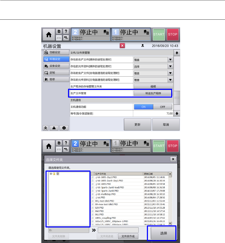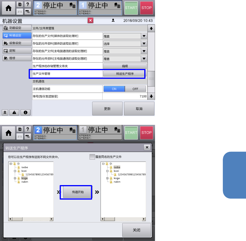 转送到哪个文件夹,再触摸[传递开始] 按钮,于是生产程序被转送。