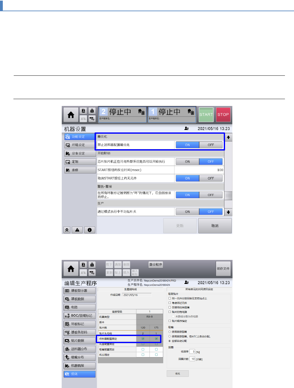 为了禁止因优化而导致送料器配置的变动,要在[机器设置] - [功能设定] 画面上将 [禁止送料器配置最优化]