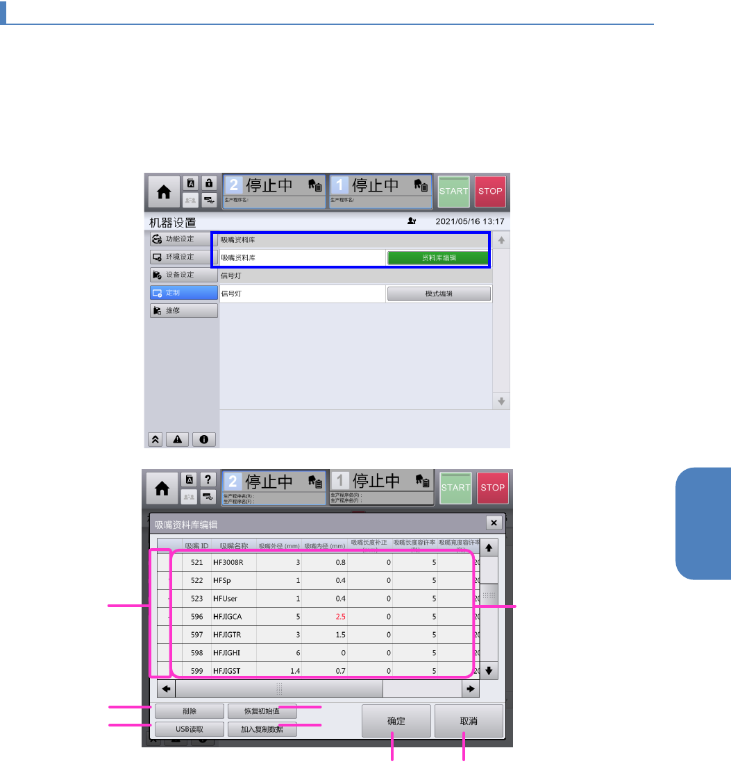 要进行吸嘴资料库的编辑时可在 [机器设置] - [定制] 画面上触摸 [资料库编辑]按钮 。出现[吸嘴资料库编辑]