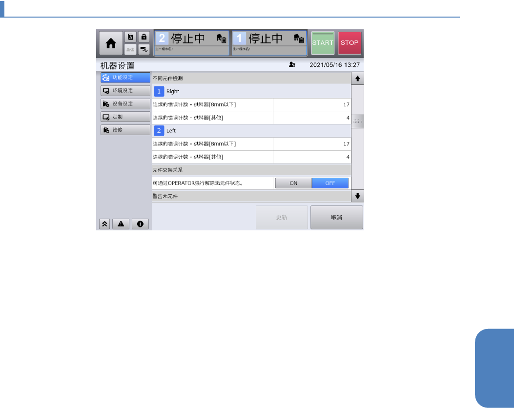 各供料器的「元件识别错误」或「元件高度异常」连续检出规定次数的错误时,将作为具有错误元件