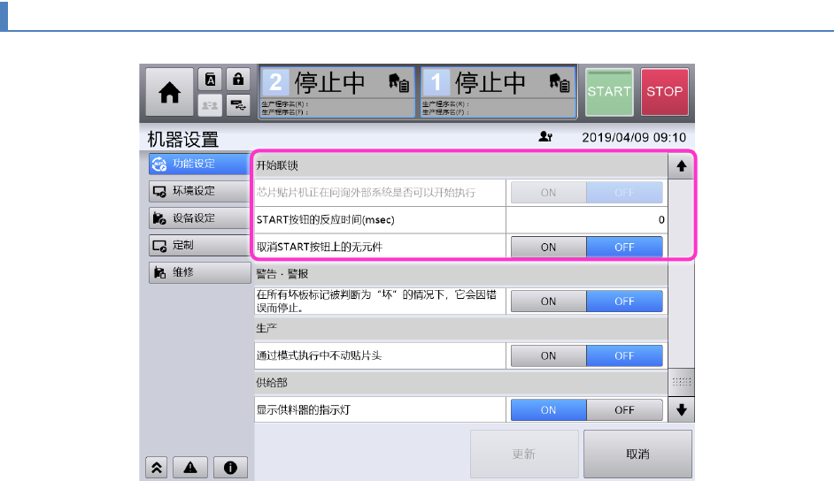 第 4 章 操作篇 4- 17 机器设置 442 4- 17 - 18. 开始联锁 芯片贴片机正在问询外部系统 是否可以开始执行 为 [ON] 时,按下 [START ] 按钮则向上级系统问询是否可 以开始执行生产动作。为 [O FF] 时,不问询即开 始生产。(初始值: [OFF] ) 要变更设定,需要将 [ 环境设定 ] 的 [ 主机通信功能 ] 设定为 [ON] ,且 [ 连接处设定 ] 设定为 [JaNets] 。 ST…