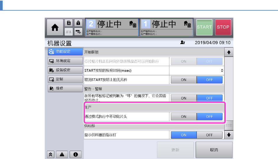 设定为 ON,则运转模式设定为空模式,在开始生产时贴片头不动作。(初始设定:OFF)