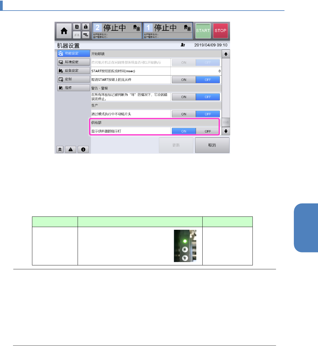 设定为 ON,则在[生产] > [供给装置] 画面选择供给部时,所选择的供给部设置供料器的 LED 闪灭显示。
