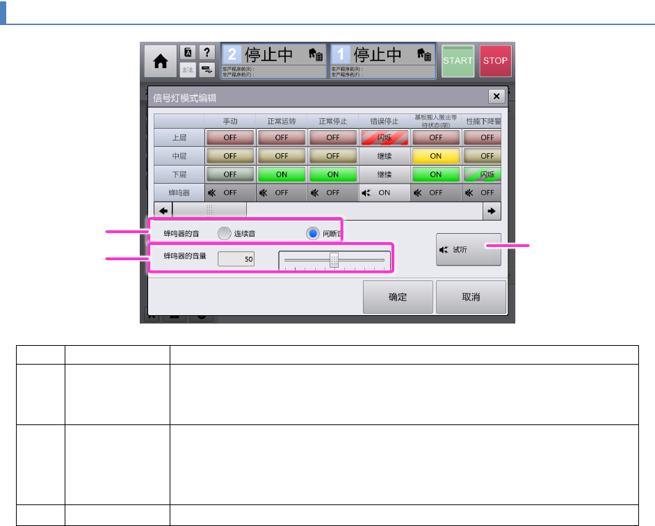 第 4 章 操作篇 4- 17 机器设置 476 4- 17 - 51. 信号灯模式编辑 记号 名称 说明 (a) 蜂鸣器的音 选择蜂鸣器 的声音 。 连续音 间断音 ( 初始设定 ) (b) 蜂鸣器的音量 调整蜂鸣器的音量。 蜂鸣器的音量仅在 蜂鸣器 的音为 [ 间断音 ] 时可以 调整。 蜂鸣器的音量设定为 0 时, 蜂鸣器 不鸣响 。 ( 值域: 0 ~ 100 。初始设定: 100) (c) 试听 可以试听设定的 [ 蜂鸣器的音…