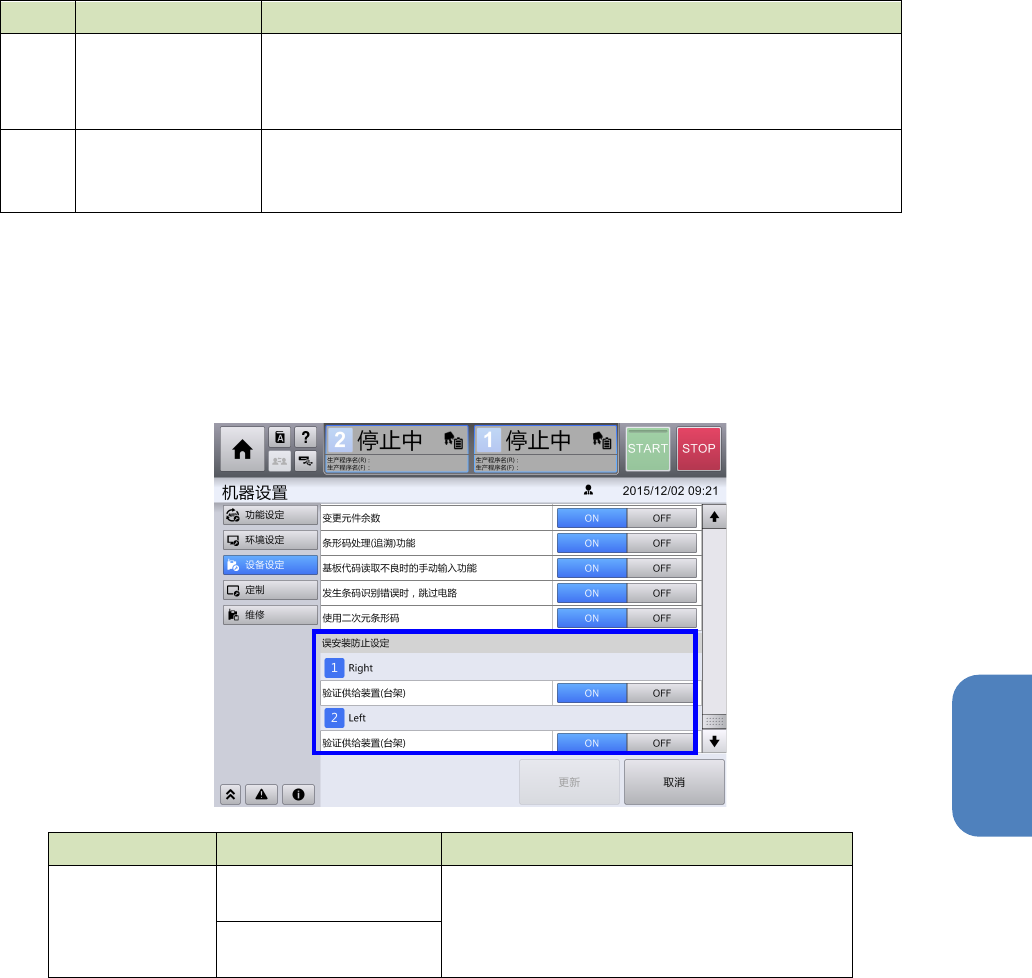 [误安装防止设定] 设定是否逐个台架实施核对确认。设定为 ON 时,生产开始前要进行元件核对。设定