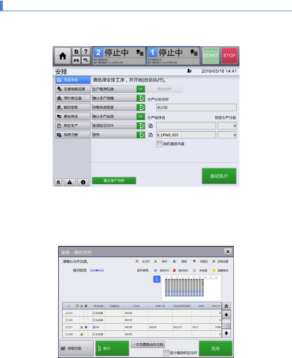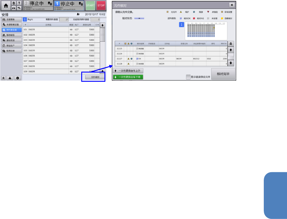 (5) 执行准备后的核对状态的确认,也可通过[顶部菜单] – [安排] – [供料器设置] 画面,在触摸[元件核对]
