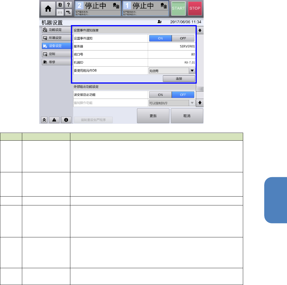 第 4 章 操作篇 4- 20 外部输出功能的 使用(选项) 525 4 设置事件通知连接 记号 名称 说明 (a) 设置事件通知 选择是否要与事件通知处的连接处理。 为了使用误安装防止功能,需要连接 到事件通知处。 • ON :连接事件通知处 • OFF :不连接事件通知处 (b) 服务器 输入事件通知处的 IP 地址或服务器名(计算机名)。 设置与生产支援系统的元件核对信息 通知用服务器相同的服务器 名。 (c) 端口号 设定追…