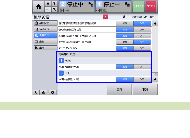 [误安装防止设定] 设定是否逐个台架实施核对确认。设定为 ON 时,生产开始前要进行元件核对。设定
