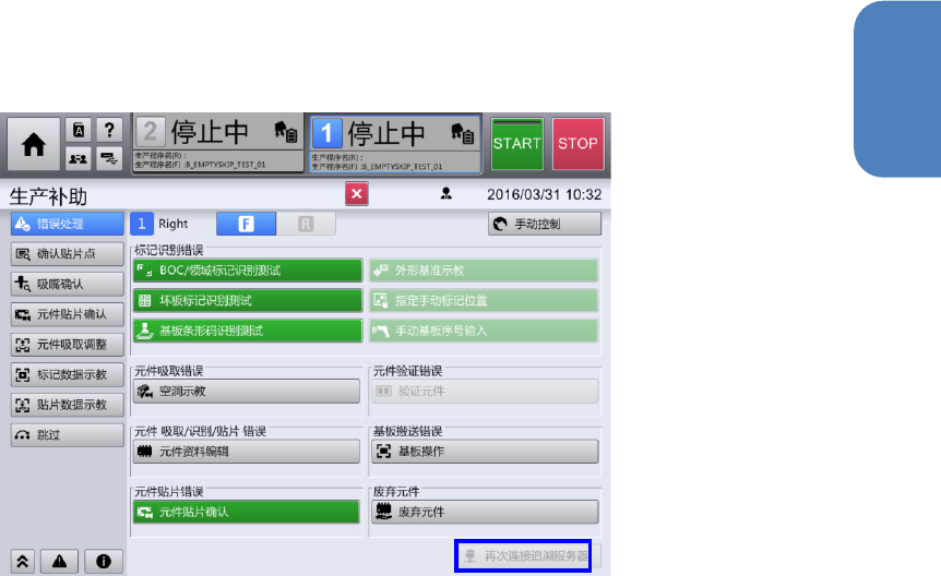 需在机器设置中重新连接服务器恢复通信。发生通信错误后,在从[顶部菜单]触摸[生产补助] - [错
