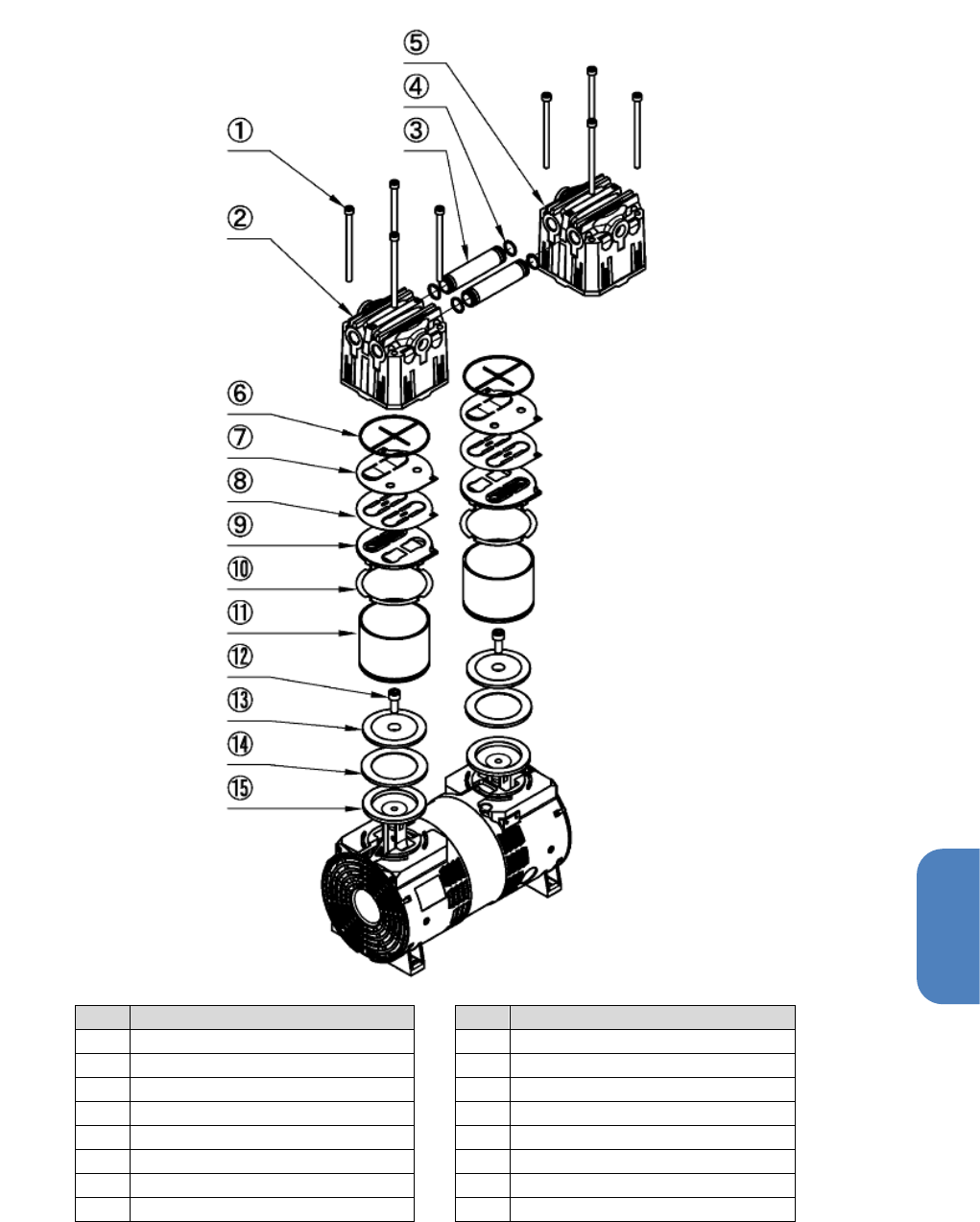 第 5 章 维护 篇 5- 2. 保养检查 45 5 真空泵分解图 No. 名称 No. 名称 1 内六角孔螺栓( M6×95 ) 8 个 9 气缸板 2 泵头护盖 1 10 气缸密封垫 3 连接管 11 气缸 4 O型圈 P- 10 12 内六角孔螺栓( M8×20 ) 5 泵头护盖 2 13 皮碗式密封圈按压装置 6 密封垫 14 皮碗式密封圈 7 压阀装置 15 连接杆 8 吸排气阀