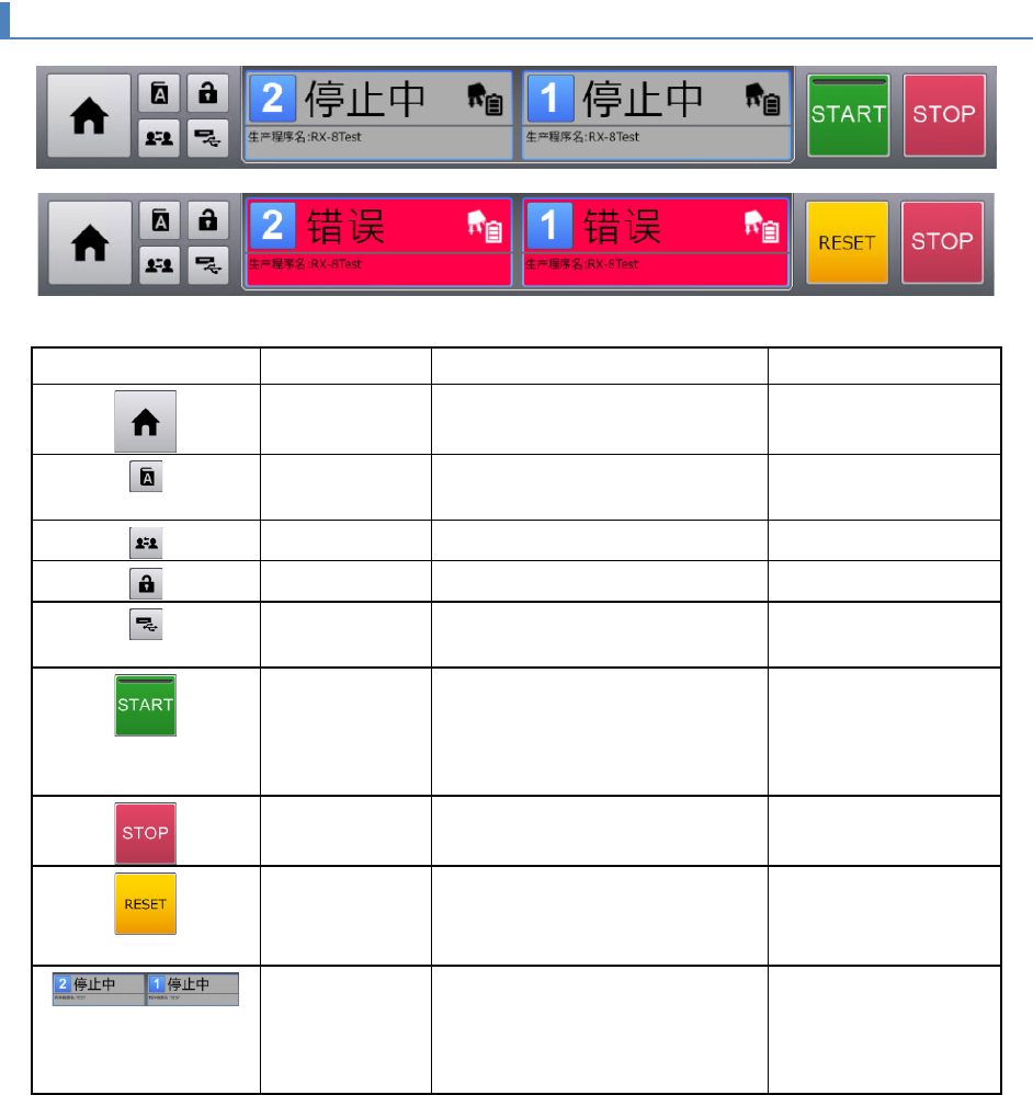 第 4 章 操作篇 4-2 操作画面构成 7 4 基本画面操作 操作画面中显示的操作如下所示。 按钮 触摸后,将执行该按钮的功能。 按钮 触摸后,将变为蓝色选中状态,并执 行该按钮的功能。 选项卡 触摸后,该选项卡将被选中,并切换 操作对象。 文本框 背景颜色为白色的文本框可输入。 可编辑的情况下,在触摸文本框后会 显示软键盘,即可 输入。 列表 存在两种情况,显示本机内部信息的 情况,以及可输入 文字的情况。 背景颜色为白色时可输…