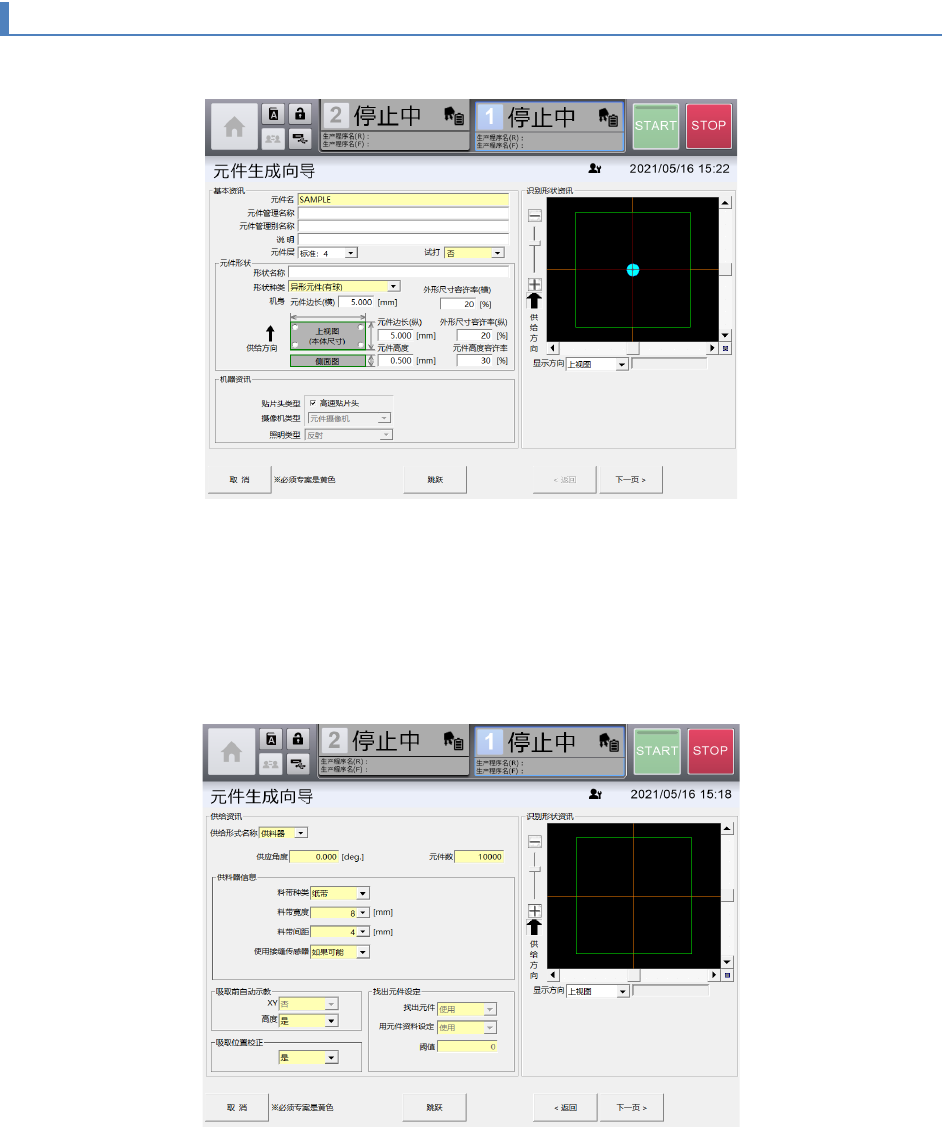 第 4 章 操作篇 4- 14 数据制作步骤 326 4- 14 - 8. 制作 异形元件 (有球)的资料 1 打开 [ 元件 生成向导 ]画面 后, 输入 元件名 。 2 从[形状种类]的下拉列表 中,选择 异形元件 ( 有球 )。 3 选择元件贴片中使用的 [ 贴片头类 型 ] 。 有些尺寸的元件,因选择的贴片头, 有时不能生成元件数据。 4 触摸 [ 下一页 ] 。 显示[ 供给资讯 ]画面。 5 从下拉列 表中分别选择 [ 供给…