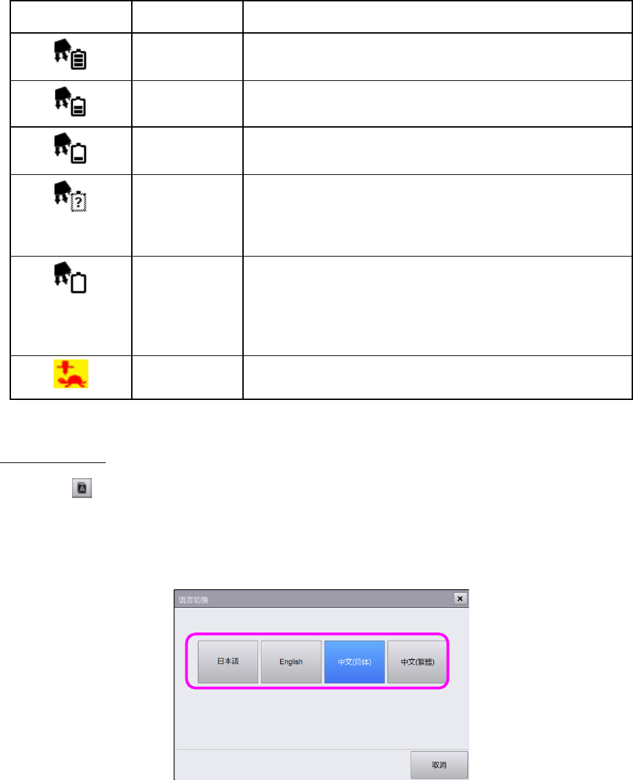 第 4 章 操作篇 4-2 操作画面构成 10 图标 状态 说明 正常 单元内的各电池电源状态 正常。 消耗 单元内的某些电池余量减少。 老化 单元内的某些电池老化, 电源 容量 降低 。请准备进行电池的更 换,执行更换作业。 断线 单元内的某些电池的线路有可能断线 。 在此状态下直接关闭 装置 的电源时,各 轴的 原点位置会消失, 如果不重新进行校准作业,则不会进 行生产。 请务必在通电状态下进行维护作业。 消失 单元内的某些电池的电…