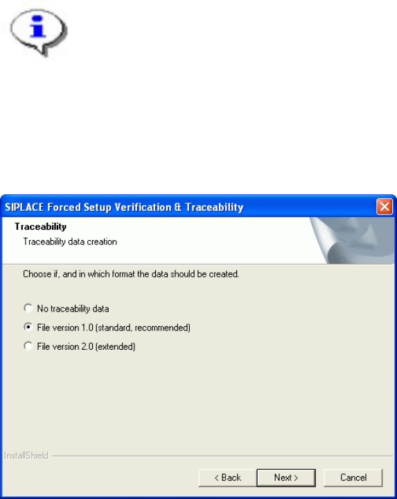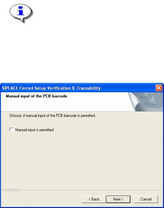 Installation Manual SIPLACE Setup Center 2.2 Step 8 Manual input of the PCB barcode Note: Traceability settings can only be changed, if the Tractability Option at the station is installed. If this checkbox is selected,…