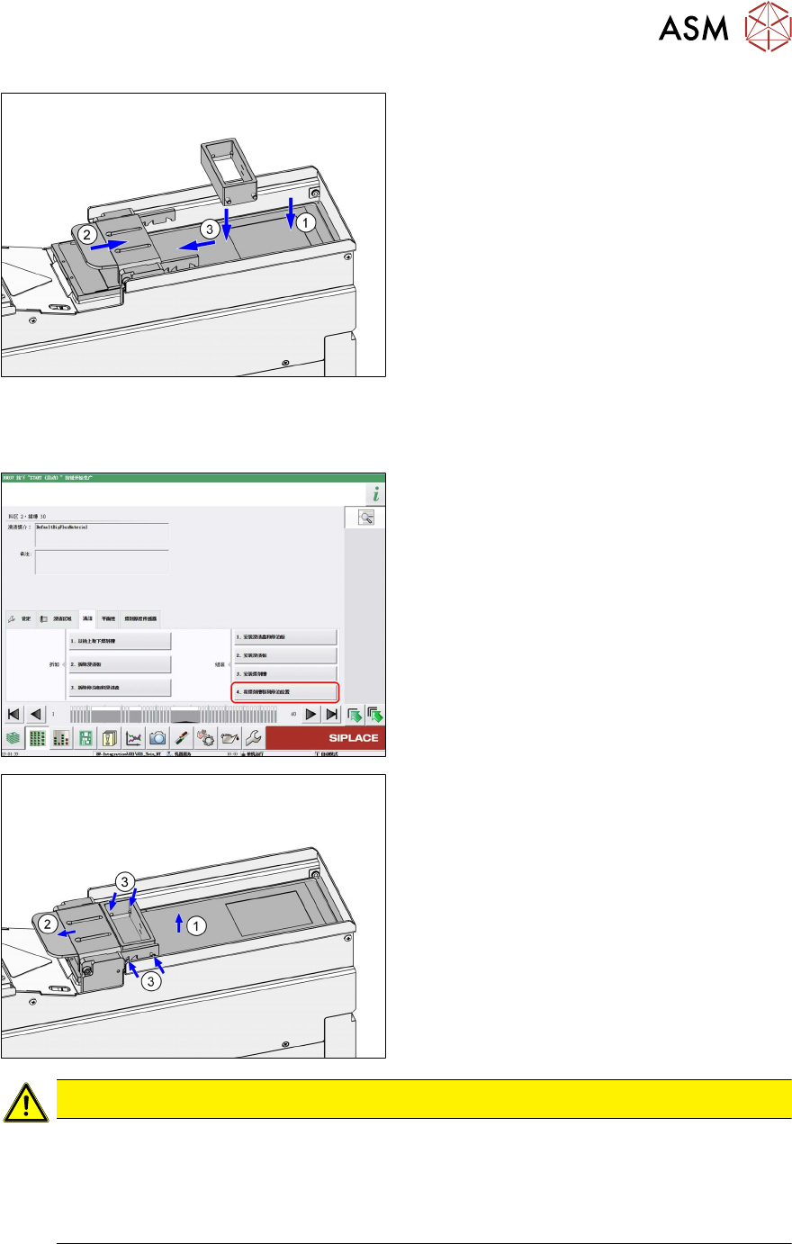 5 清洁 5.4 重新安装已清洁的部件 用户手册 SIPLACE Linear Dipping Unit 2 X 05/2020 103 (1) LDU 将升降轴向下移动。 (2) LDU 将刮刀向前移动。 ► (3) 将焊剂罐放置在浸渍板上,并将其从向 下保持器下方推至固定挡块处。 使用小型焊剂罐时,其朝向很重要:焊剂罐较厚 的一面壁应朝向挡板。 将焊剂罐移至停驻位置 前提条件:已安装挡板和浸渍板。 ► 单击 Move flux ta…