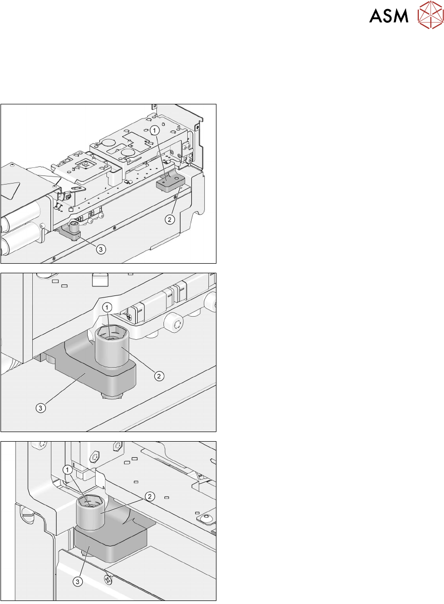 3 功能描述和结构 3.2 结构 用户手册 SIPLACE Linear Dipping Unit 2 X 05/2020 35 3.2.8 调平装置 调平装置基于三点支撑:一个轴承滚珠和两个调节螺钉。前部轴承座位于轴承滚珠和前部调节螺钉 上。后部轴承座位于后部调节螺钉上。 1. 前部轴承座 2. 轴承滚珠 3. 后部轴承座 1. 后部固定螺钉 2. 后部调节螺钉 3. 后部轴承座 1. 前部固定螺钉 2. 前部调节螺钉 3. 前部轴承…