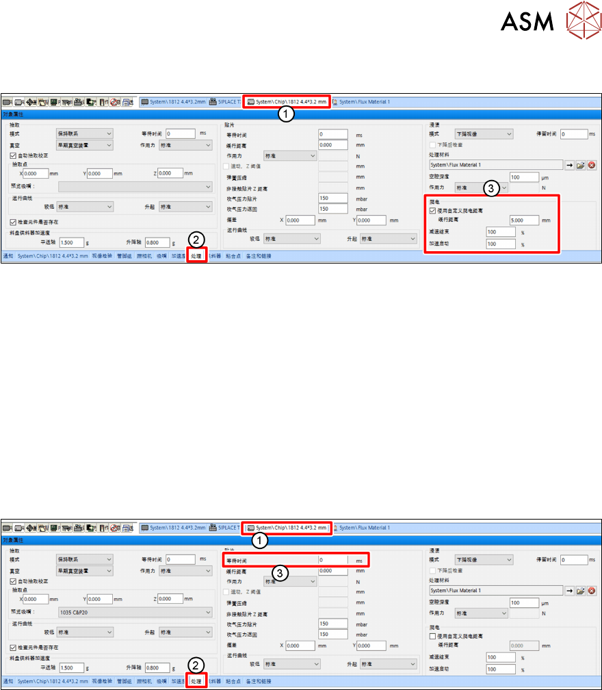 4 操作 4.1 SIPLACE Pro 的设置 用户手册 SIPLACE Linear Dipping Unit 2 X 05/2020 59 4.1.9 设置缓行距离 ► 在 SIPLACE Pro 中,单击所需元件 (1) 的元件形状选项卡。 ► 单击 Object Properties 视图中的 Handling 选项卡 (2) 。 ► 启用 Dipping 区域中 Creeping (3) 下的 Use custom c…